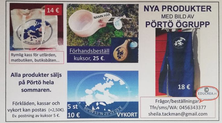 Dessa nya produkter med bild av Pörtö ögrupp säljs främst i direktförsäljning, Finns på Kafimysson! Kan också postas (betalas i förväg). Kontakta mej via sms/WhatsApp 0456343377 eller e-post: sheila.tackman(a) gmail.com